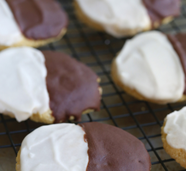 Spread each cookie with half of the white frosting and half of the chocolate frosting. Let cool until set.