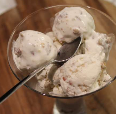 Add the pecans to the ice cream in the last few minutes of churning. Spread the ice cream in a freezer-safe container and freeze another hour or two, until firm.