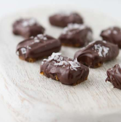 Place the melted chocolate in a large bowl. One piece at a time, dip the caramel into the chocolate and transfer back to the parchment paper. Sprinkle with a touch of salt and repeat with remaining pieces. Allow the chocolate-covered caramels to cool on the counter or transfer to the fridge to set quicker.