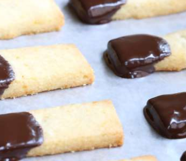 Line another baking sheet with wax paper. In a heatproof bowl set over a pan of barely simmering water, melt chocolate until smooth. Dip the ends of each shortbread stick into melted chocolate and place on prepared baking sheet. Chill until chocolate is set.