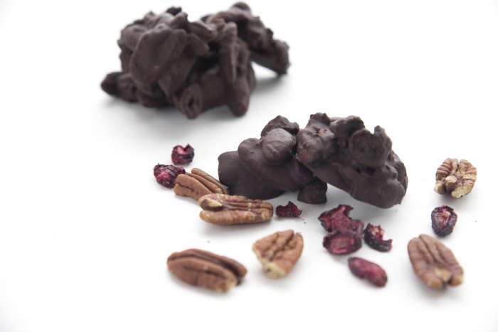 Stir in the toasted nuts and the dried cranberries, coating well with chocolate. Spread a baking sheet with waxed paper or parchment paper and drop rounded spoonfuls of the mixture onto the paper. You should get about 18 clusters.