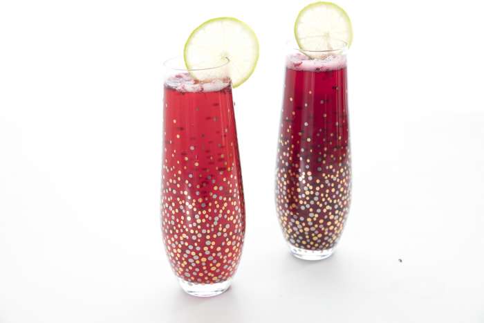 For the mimosas, add 1 tbsp lime juice and 2 tbsp hibiscus syrup to each of 4 champagne glasses. Top up with champagne.