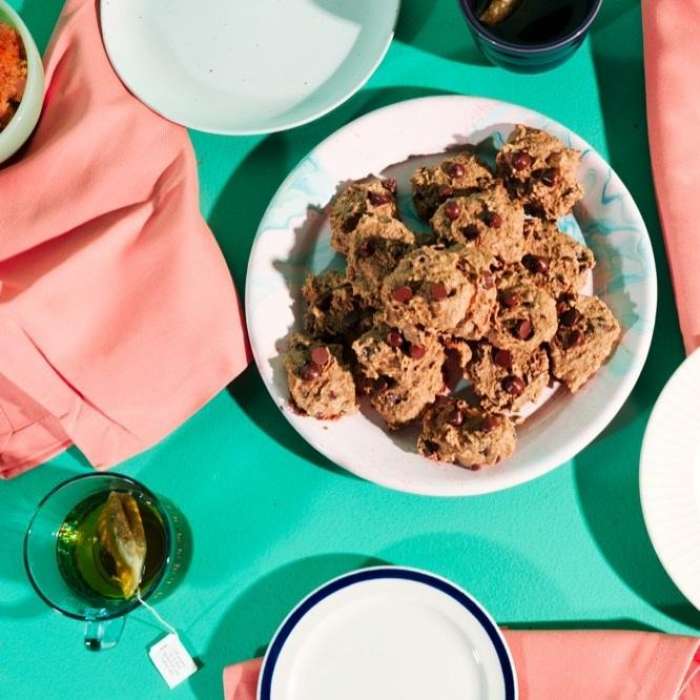 Place 1 heaping tablespoon of batter per cookie on the prepared baking sheet(s). Next, slightly dampen two fingers with water and gently press down on each mound of batter to flatten into cookie shapes (unlike classic cookies, these will not automatically flatten out in the oven, so this is an important step). Sprinkle a few extra decorative chocolate chips on top. Place in the oven on the middle rack and bake for about 12 to 15 minutes or until they’re light golden brown.