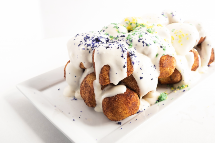 Gently spread cream cheese icing onto Monkey Bread, then add Swerve sprinkles.